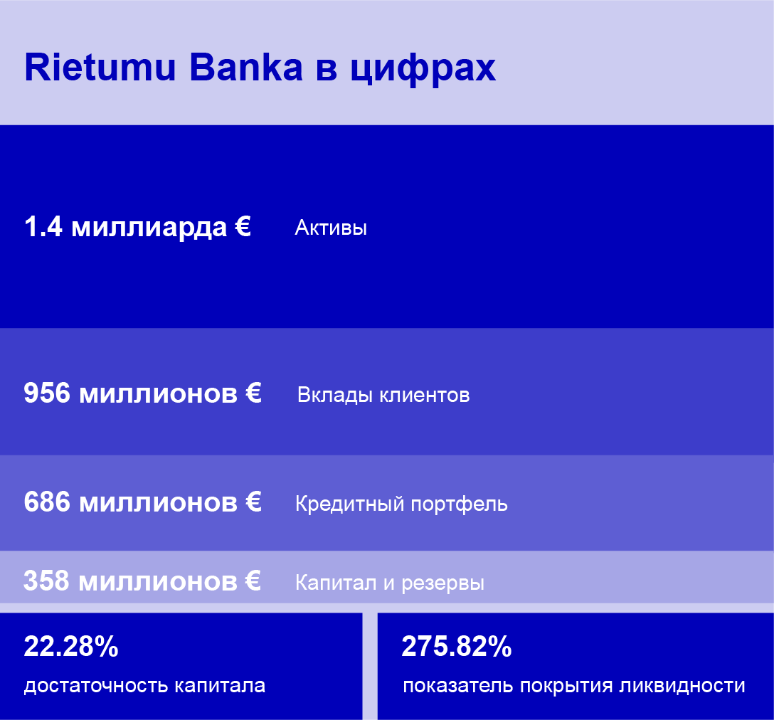 Мы входим в пятерку крупнейших коммерческих банков Латвии. В европейской системе финансового надзора Rietumu Banka признан другим системно значимым кредитным учреждением наряду с крупными европейскими банками.